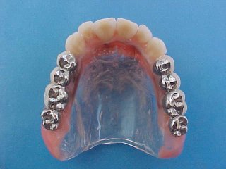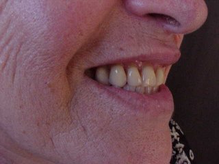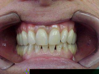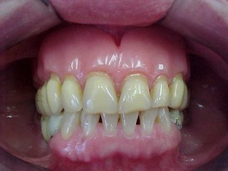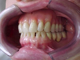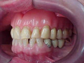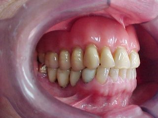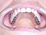 Caso tratado por substituição de dentadura superior com oclusais metálicas e próteses metalo-cerâmicas (porcelana) inferiores.