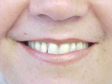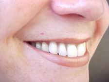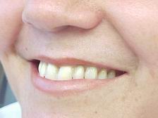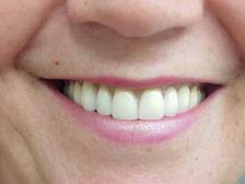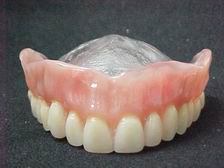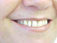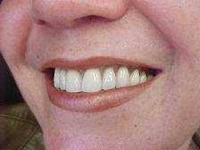 Caso reabilitado por substituição da dentadura superior. Utilizamos gengiva artificial caracterizada (cor natural), palato incolor e dentes posteriores com faces oclusais metálicas (primeiros pré-molares).