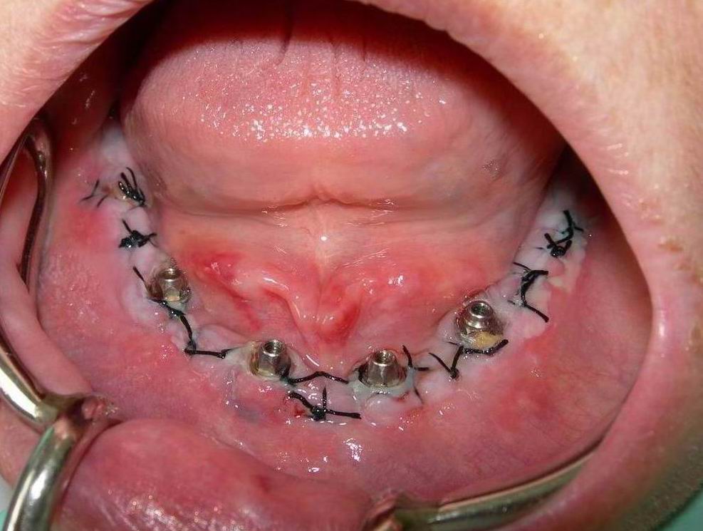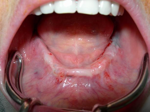 Mucosa sobre rebordo alveolar inferior momentos antes da cirurgia de instalação dos implantes osseointegráveis (anestesia local)