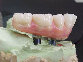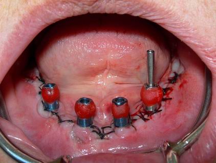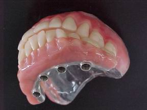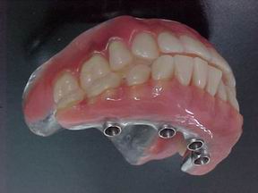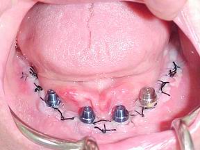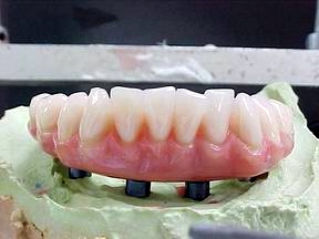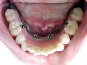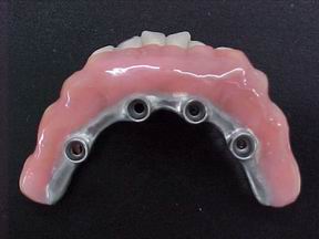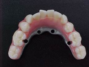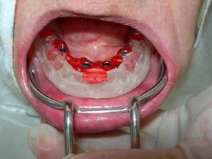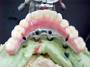 Prótese protocolo de carga imediata instalada direta sobre os implantes osteointegráveis. Observem-se os parafusos de fixação assentados nos orifícios da barra metálica