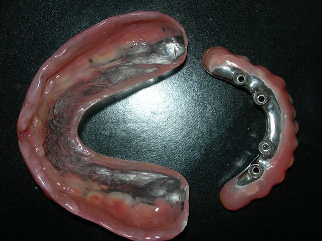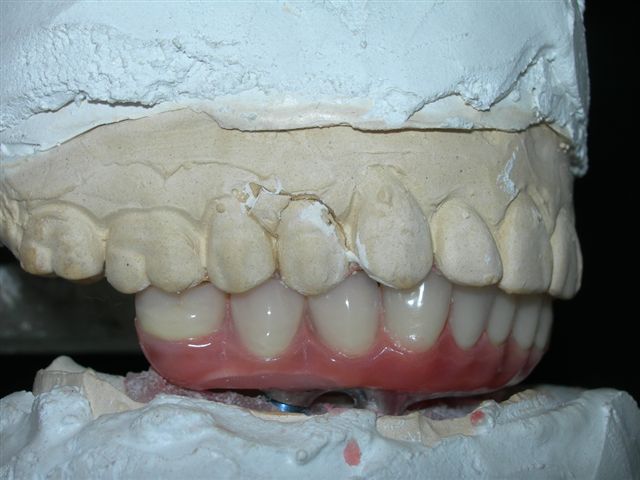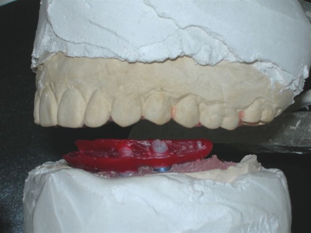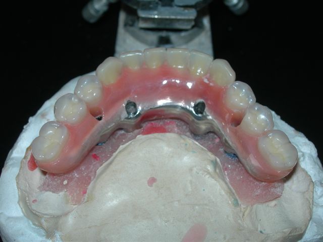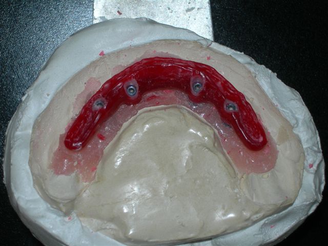 | Seqüência cronológica laboratorial: 1) Fase de construção da barra protocolo com cera e componentes calcináveis e 2) Acrilização final |