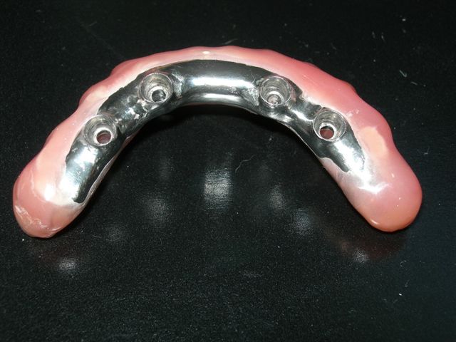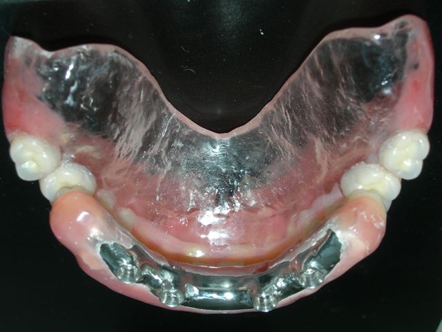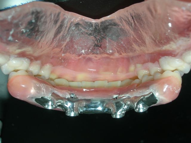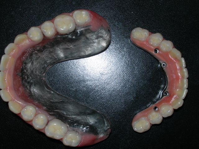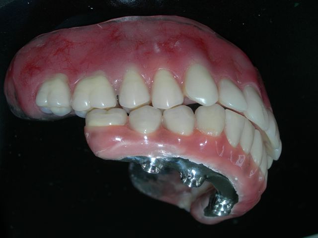 Próteses antagonistas articuladas entre si sobre bancada (Vista do ângulo de insercção da prótese protocolo inferior) |