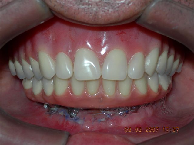 O Planejamento, a cirurgia para instalação dos implantes de titânio e as articulações dentárias (montagem laboratorial) do caso apresentado nesta página foram realizadas pelo Dr. Amilcar Fernandes da Silva Neto.