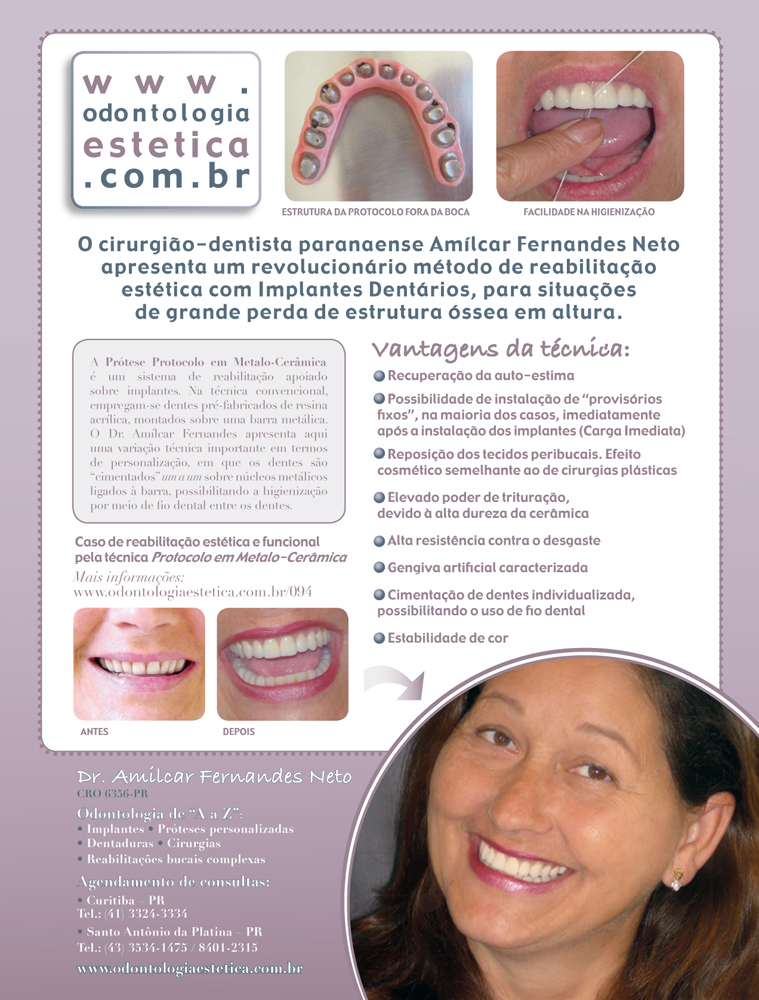 O Planejamento, a cirurgia para instalação dos implantes de titânio e as articulações dentárias, provisórios, ortodontia em mandíbula, próteses inferiores e dentisteria(restaurações) do caso apresentado nesta página foram realizadas pelo Dr. Amilcar Fernandes Neto.
