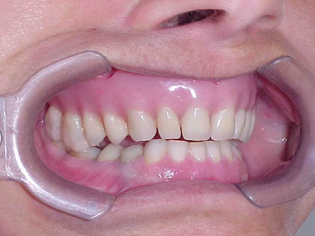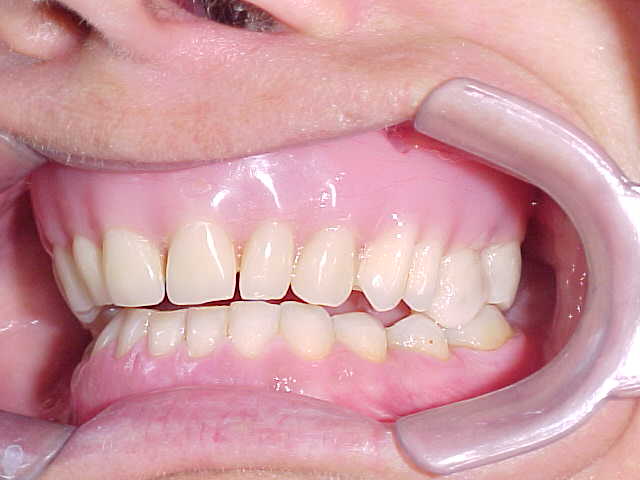 Vista lateral direita após correção ortodôntica e finalização da protocolo com dentes individuais em metalocerâmica