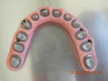 Conceito: Barra Metálica com núcleos contornados por acrílico imitando o tecido gengival (vista oclusal)