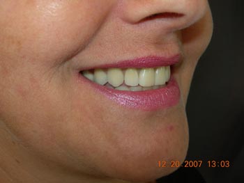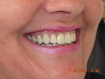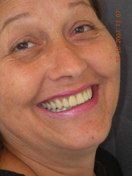 Vista lateral esquerda após correção ortodôntica e finalização da protocolo com dentes individuais em metalocerâmica