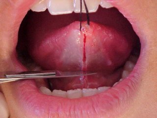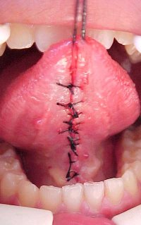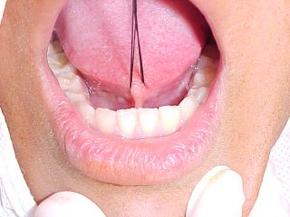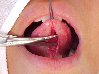 | Esta técnica cirúrgica destina-se à liberação dos movimentos funcionais da língua . Neste caso a inserção mais anterior se mostra aderida à gengiva: